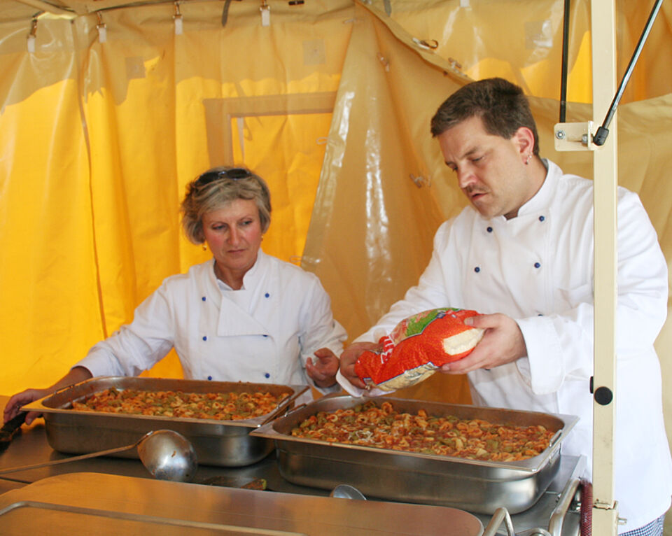 Deisenhofen genießt einen guten Ruf, was die Herstellung von Verpflegung angeht. Darauf sind die ehrenamtlichen Mitarbeiterinnen und Mitarbeiter zu recht stolz. Andererseits verpflichtet dieser Anspruch auch zu immer neuen Höchstleistungen. Wichtigstes Anliegen daher: weg vom "Gulaschkanonen-Image". Ein für allemal: wenn das Rote Kreuz kocht, gibt es nicht unbedingt Gulaschsuppe! Wenn Preisvorgaben, Rahmen und Vorbereitungszeit stimmen, sind anspruchsvolle Mehrtopfgerichte möglich, die nichts mit Feldverpflegung zu tun haben.