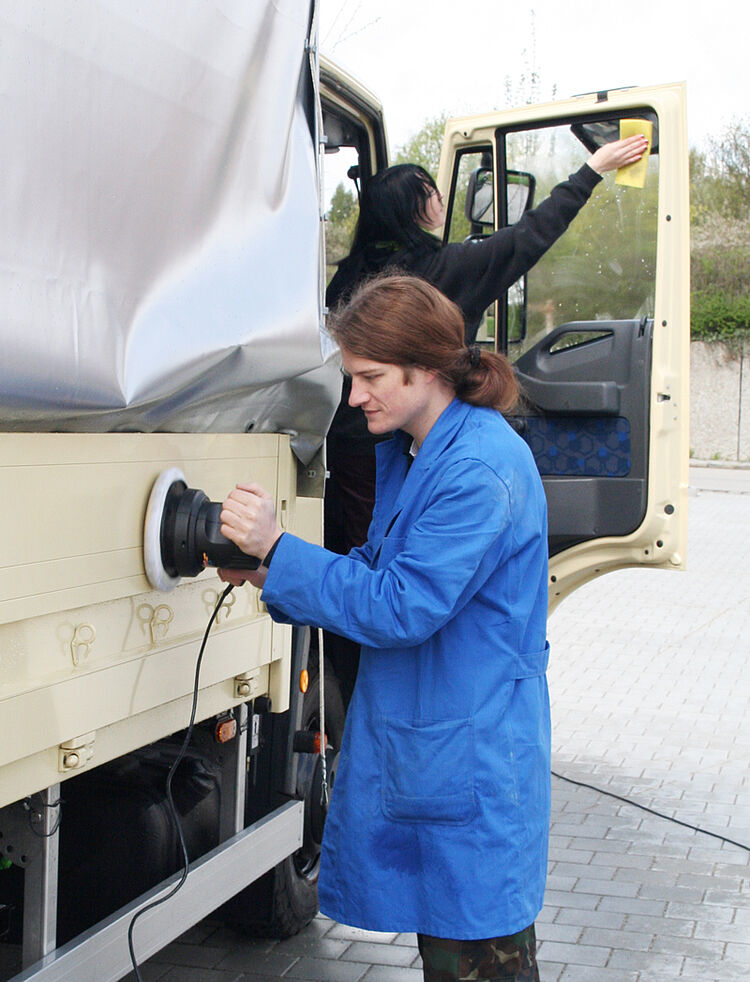 Auch der LKW will ab und an gereiningt werden: Mit vereinten Kräften geht es schneller...