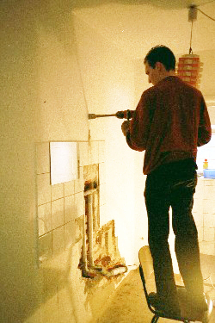 Legendäres Ereignis im alten Rotkreuzhaus: Stefan mit seiner Lieblings-Hilti ("Schau mal von außen, ob ich schon durch bin!")