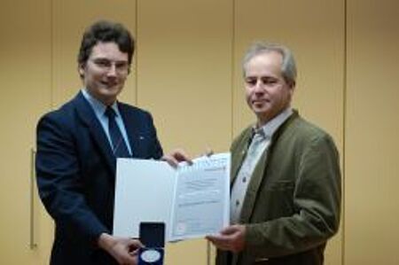 Georg-Michael Kaiser von der Kolpingsfamilie und Johannes Ertl, Vorsitzender der Wählergemeinschaft Oberhaching (WGO) nahmen die Ehrenplakette des Bayerischen Roten Kreuzes in Silber entgegen.