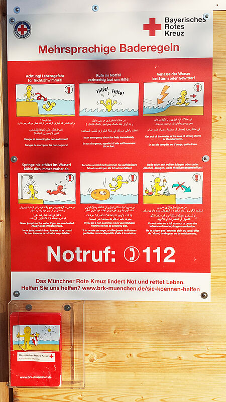 "Wir haben die wichtigsten sechs Baderegeln zusammengefasst, in Bildern dargestellt und neben Deutsch auch auf Englisch, Französisch, Arabisch und Dari/Farsi erklärt", sagt Sabine Wagmüller, stellvertretende Vorsitzende des Münchner Roten…