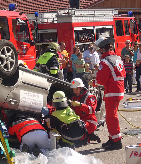Am vergangenen Sonntag hatten unsere Nachbarn von der Freiwilligen Feuerwehr Oberhaching zum Tag der offenen Tür ins Gerätehaus eingeladen. Ehrensache, dass auch das Rote Kreuz über seine ehrenamtliche Arbeit informierte und sich auch aktiv an einer Rettungsübung beteiligte. Das Übungsbeispiel: Ein Auto hatte sich bei einem Unfall überschlagen, ein Verletzter war darin eingeklemmt. Das Notfallteam des Roten Kreuzes, das aus einem Notarzt und zwei weiteren Rettern bestand, versorgte den realisitisch geschminkten Verletzten und befreite ihn gemeinsam mit der Feuerwehr aus dem Wrack.