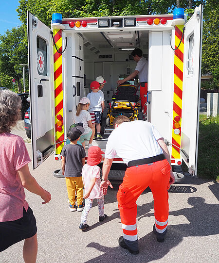 Am Freitag besuchten zwei ehrenamtliche Helfer des Deisenhofener Roten Kreuzes den Kinderpark und die Hachinger Spielmäuse in Deisenhofen mit einem Rettungswagen, um den Kindern zu zeigen und zu erklären, wie und bei welchen Notfällen die Ausstattung des Rettungswagens zum Einsatz kommen kann.