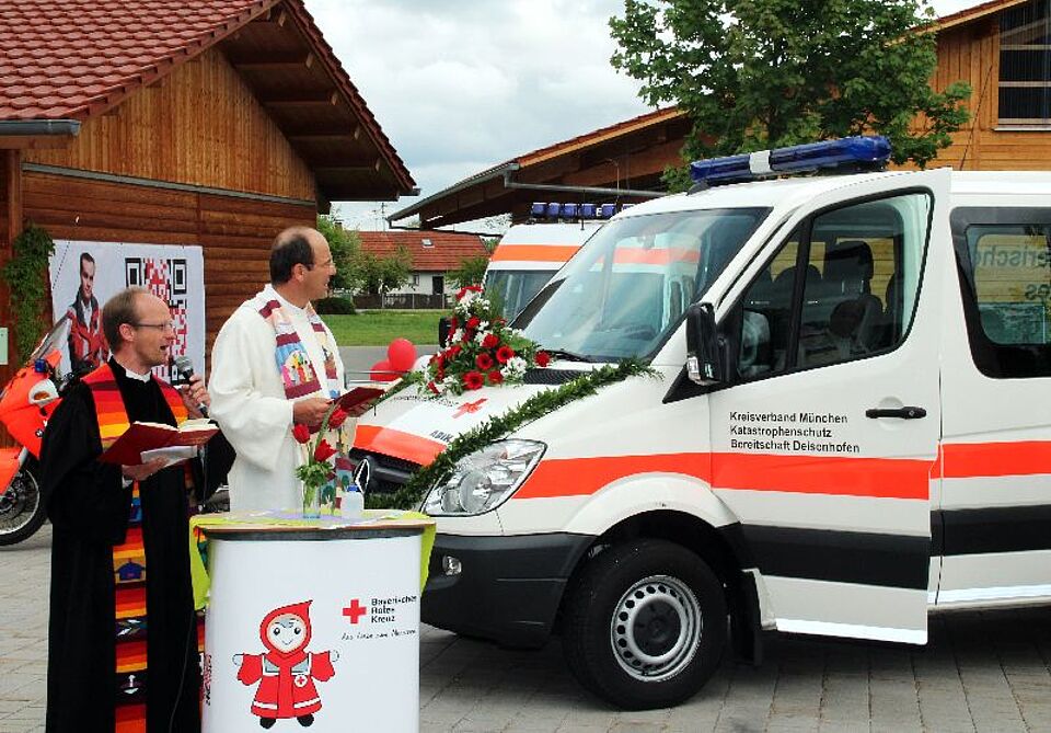Nach der ökumenischen Segnung der Fahrzeuge durch Pfarrer Karmann und Pfarrer Schaller richteten Thomas Frimmer, Leiter der Bereitschaft Deisenhofen, Landrätin Johanna Rumschöttel, Bürgermeister Stefan Schelle sowie Dr. Hildegard Kronawitter, Vorsitzende des Münchner Roten Kreuzes und Kreisbereitschaftsleiter Werner Masanz ihre Grußworte an die geladenen Gäste.