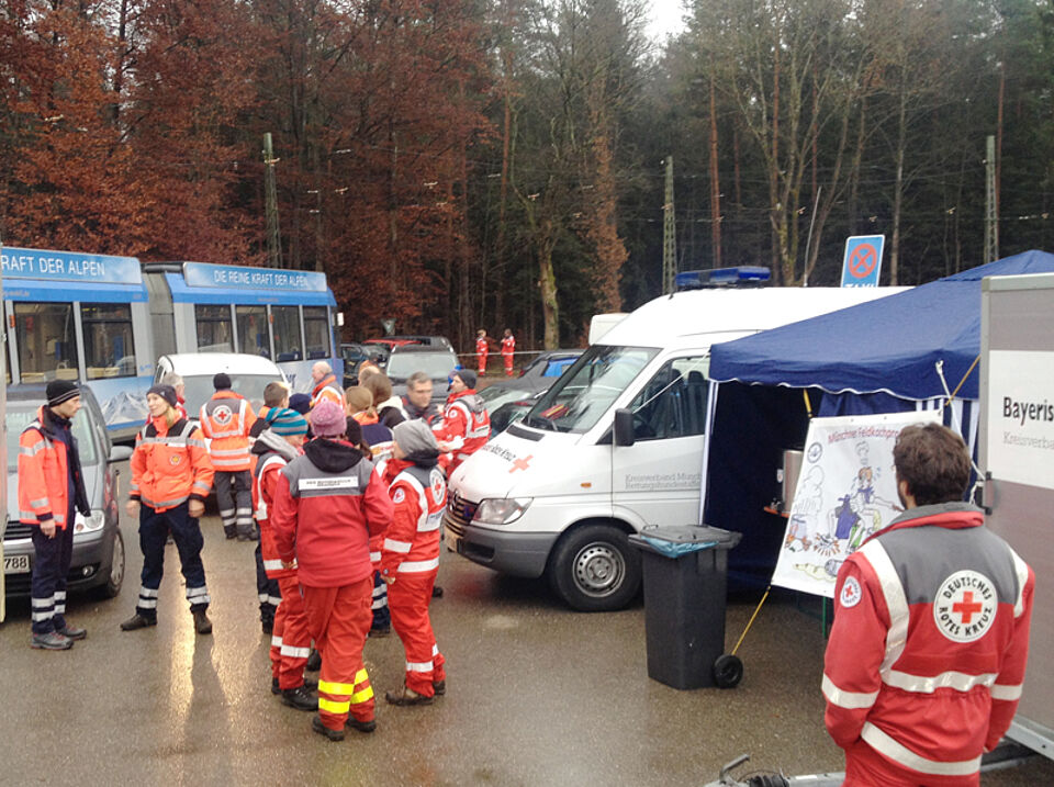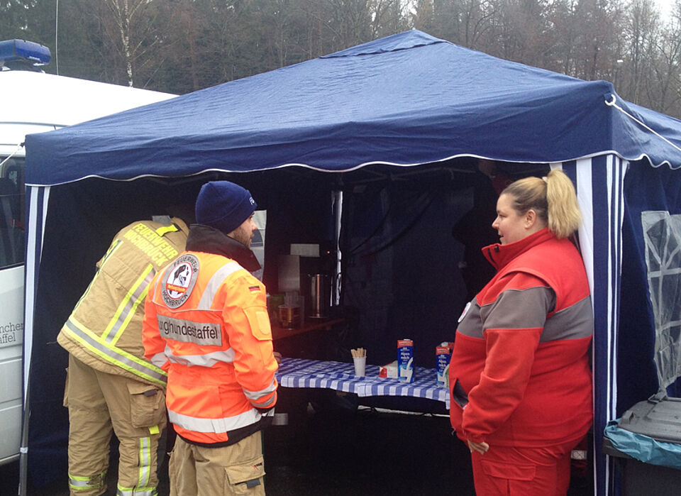 Die ehrenamtlichen Helfer des Deisenhofener Roten Kreuzes verpflegten am Sonntag gemeinsam mit Kollegen der Bereitschaft Süd 2 die Einsatzkräfte. Dazu stellten sie in der Großküche der Kreisgeschäftsstelle warmen Eintopf her, den die Helfer der Bereitschaft Süd 2 zusammen mit warmen Getränken in Geiselgasteig ausgaben.