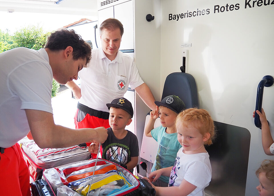 Um die Scheu zu verlieren, durften die Kinder den Rettungswagen von innen wie außen ganz genau unter die Lupe nehmen und wurden dabei von den beiden Sanitätern begleitet und mit Informationen zu den verschiedenen Materialien und Geräten sowie deren Funktionen versorgt.