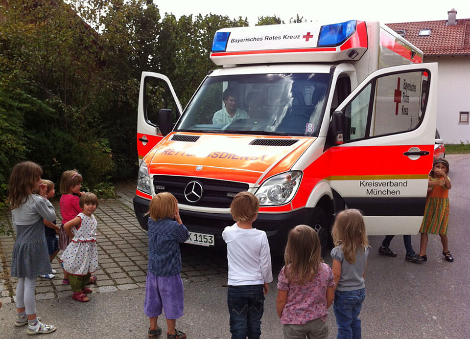 Gleich doppelt für Kinder im Einsatz waren die ehrenamtlichen Helfer des Deisenhofener Roten Kreuzes am Mittwoch. Vormittags besuchten sie mit Rettungswagen und Notarzteinsatzfahrzeug die Hachinger Spielmäuse. Dabei hatten die Kindergartenkinder die Chance, die Fahrzeuge ausführlich zu erkunden und natürlich auf der Trage probezuliegen.