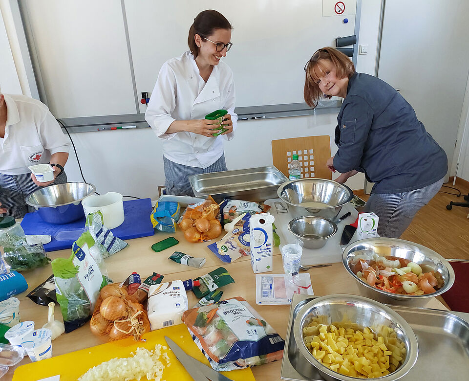Dabei wurden auch drei einfache Rezepte erprobt, die im Einsatzfall auf der Feldküche gekocht werden können. Nach der Qualitätssicherung beim gemeinsamen Mittagessen werden die Rezepte noch angepasst.