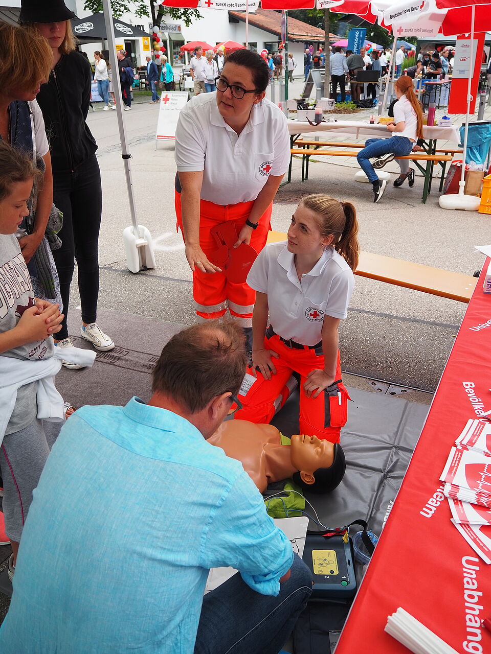 Sehr interessiert waren die Besucher*innen auch an der Herz-Lungen-Wiederbelebung und Handhabung der Defibrillatoren. Um die in der Gemeinde Oberhaching an unterschiedlichen Standorten frei zugänglichen Defibrillatoren im Ernstfall nutzen zu können, ist es natürlich unerlässlich, über die Anwendung Bescheid zu wissen. Die Herzdruckmassage durften die interessierten Besucher*innen - stets begleitet von hilfreichen Anleitungen und Tipps der Helfer*innen - an einer Puppe auch selbst trainieren.