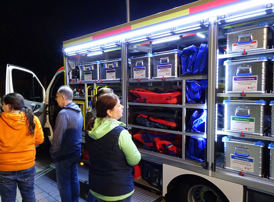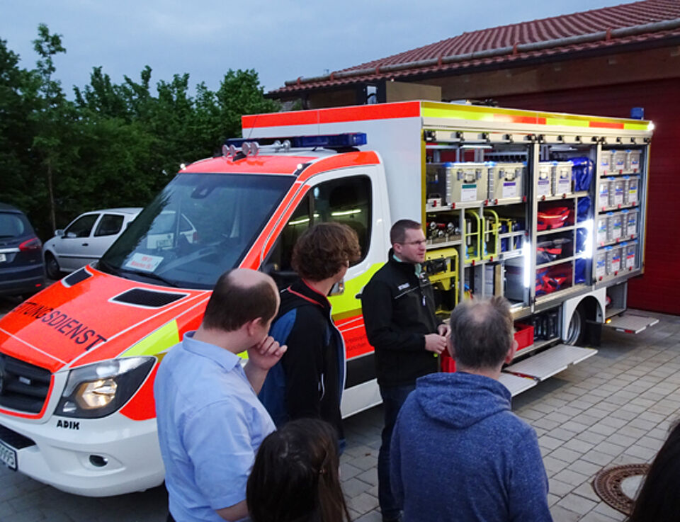 Referent Peter Lechner, erfahrener Einsatzleiter des Münchner Roten Kreuzes, stellte die aktuellen Konzepte in Stadt und Landkreis München vor und ging dabei auf wichtige Verhaltensweisen zum Eigenschutz ein. Nach dem theoretischen Impuls stellte Sönke Lase, Leiter Rettungsdienst des Münchner Roten Kreuzes, den neuen Gerätewagen Rettungsdienst vor. Das Fahrzeug ist rund um die Uhr einsatzbereit und dient bei Einsätzen mit vielen Verletzten als Materialdepot für den Rettungsdienst, bis die ehrenamtlichen Schnelleinsatzgruppen mit weiterem Material eintreffen. Die Helfer*innen nutzten Vortrag und Fahrzeugpräsentation für Fragen und intensiven Austausch.