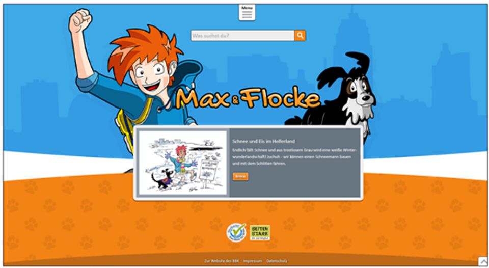 www.max-und-flocke-helferland.de bietet das Bundesamt für Bevölkerungsschutz und Katastrophenhilfe (BBK) eine Internetseite an, um Kinder zwischen sieben und zwölf Jahren mit Gefahren im Alltag vertraut zu machen. Kinder und Jugendliche können hier wichtige Verhaltensregeln zu den Themen wie Brandschutz, Erste Hilfe, Notruf, Ehrenamt und Selbsthilfe erlernen, die sich sehr nachhaltig auf das gesamte weitere Leben auswirken.