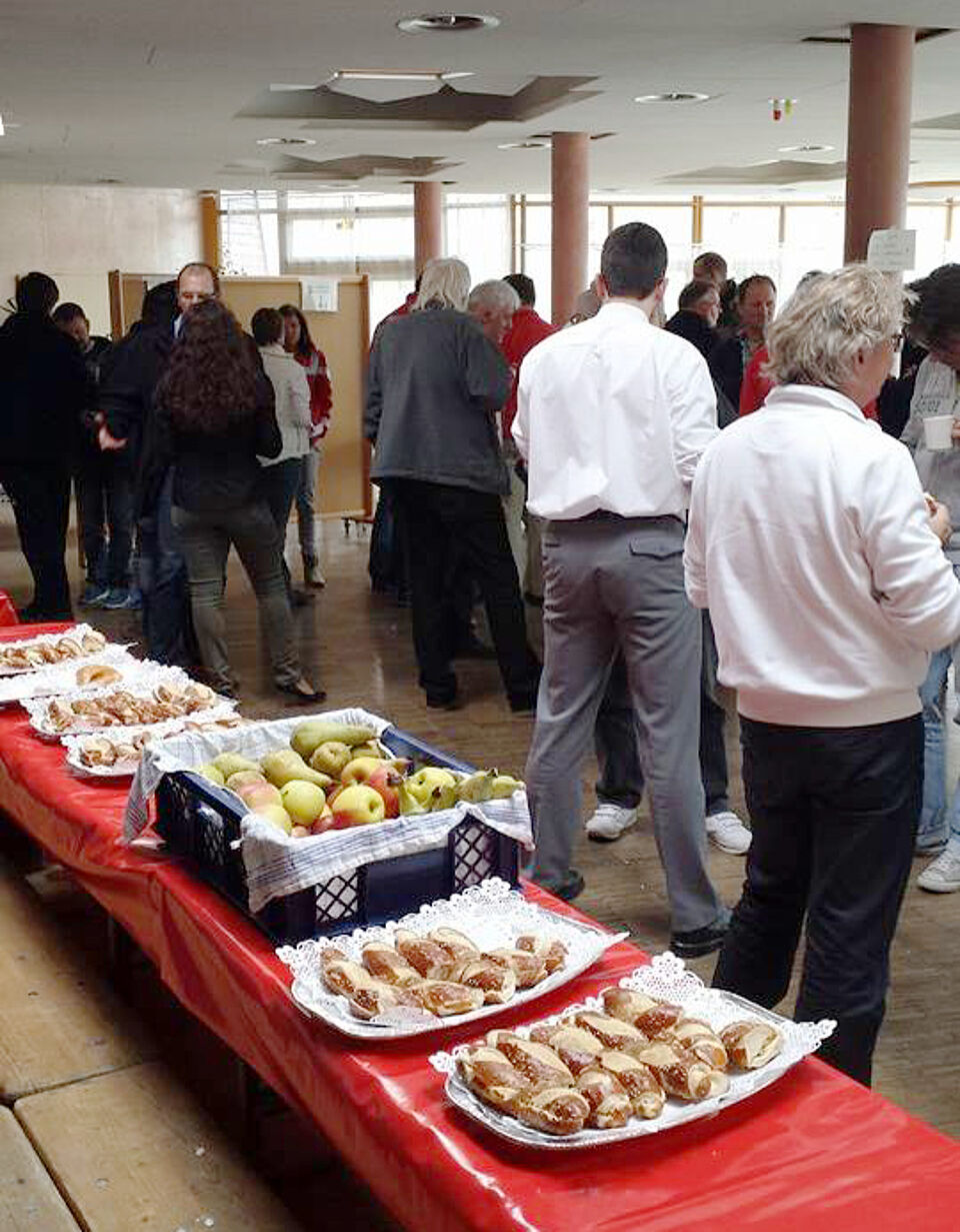 Verpflegungsdienst des Münchner Roten Kreuzes für das leibliche Wohl der Rotkreuzkollegen. Bereits am Donnerstag kauften die ehrenamtlichen Helfer ein, am Freitag bauten sie die Ausgabestelle in Johanneskirchen aus. Der Samstag begann dann um fünf Uhr morgens mit dem Abholen der Brezenstangen beim Bäcker. Während Helfer der Bereitschaft Süd 2 in Johanneskirchen das Frühstück ausgaben, kochten die Helfer der Bereitschaft Deisenhofen schon das Mittagessen: Putenschnitzel in Tomatensauce mit Reis oder alternativ Mediterraner Gemüsereis und eine Bayerisch Crème mit Himbeersauce. Nachmittags gab es dann noch Kuchen.
