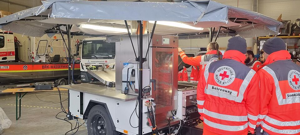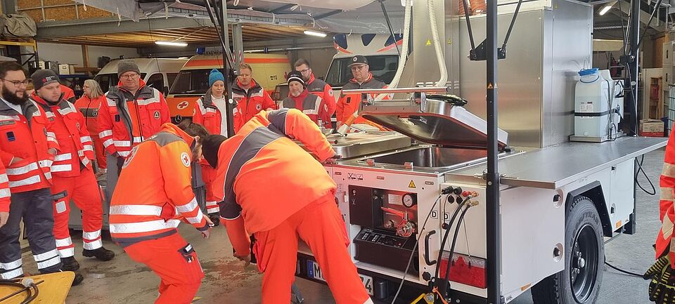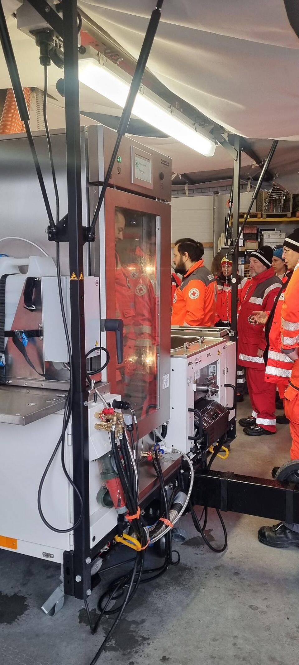 Ihre erste Bewährungsprobe hatte sie auf einem Verpflegungslehrgang des Roten Kreuzes in Landsberg. Dort erhielten die Teilnehmer*innen eine Einweisung zum Aufbau und zur Inbetriebnahme der Feldküche. Im Vergleich zur Vorgängerin gibt es deutlich mehr Technik und Elektronik, zudem wird sie mit Diesel statt wie bisher mit Gas betrieben. Umso wichtiger ist es, sich in Ruhe mit dem Gerät und seinen Möglichkeiten vertraut zu machen.