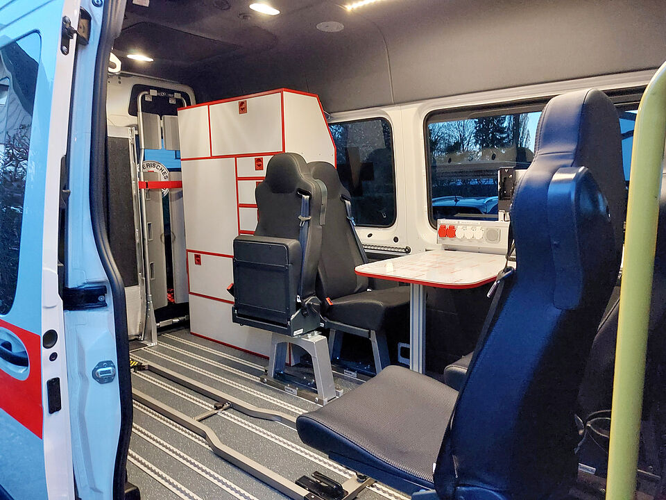 Das Herz des Fahrzeugkonzepts bildet der Systemboden, der eine maximal flexible Positionierung von Sitzen, Tisch, Möbeln, einer Trage oder bis zu zwei Rollstühlen, aber auch die professionelle Sicherung von Ladung ermöglicht. Der Tisch und ein Materialschrank wurden nach individuellen Vorgaben hergestellt und eingebaut, ein Kommunikationsplatz im Fahrgastraum eingerichtet und alle Einbauten von einem Gutachter geprüft und abgenommen.