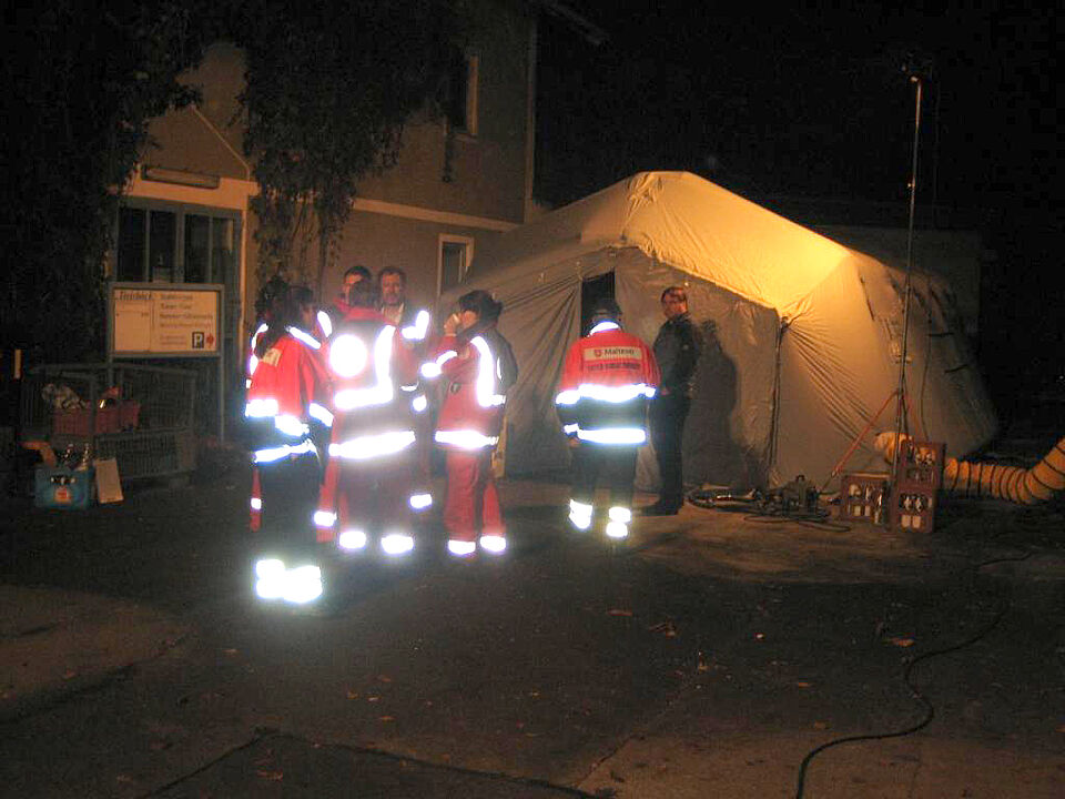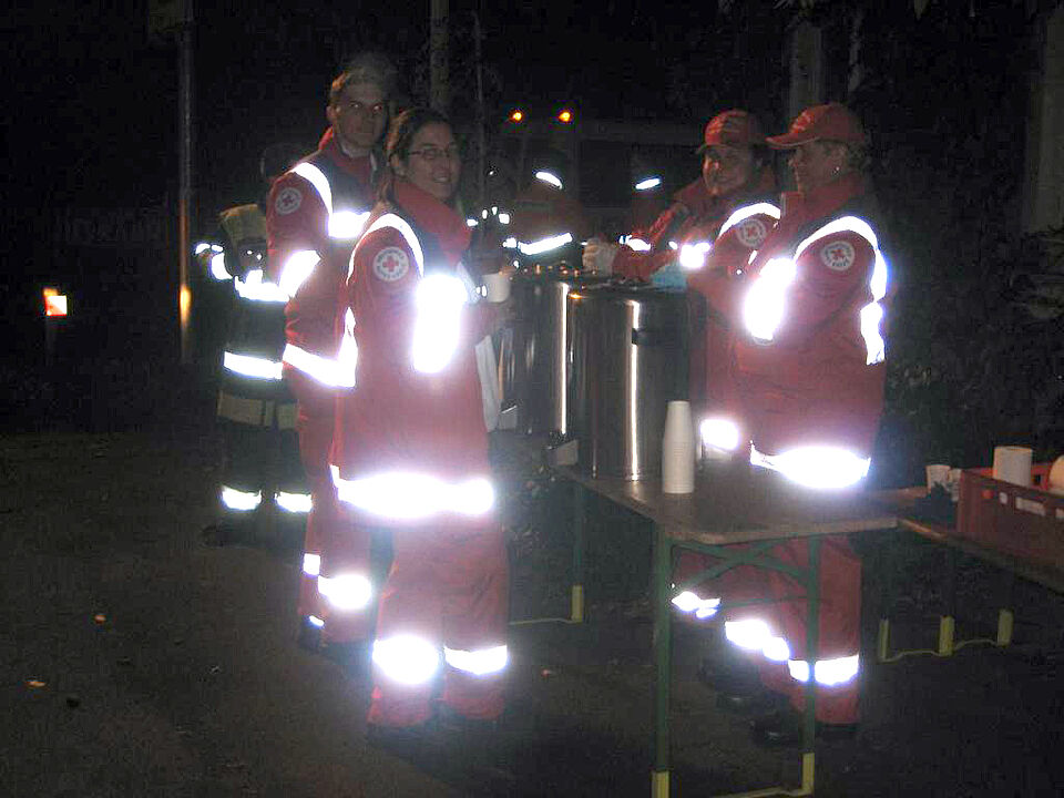Neben der Registrierung der Betroffenen, die nicht nur in Deutsch sondern aufgrund von zahlreichen Nationalitäten primär in Englisch erfolgte, sorgte die Schnelleinsatzgruppe Betreuung in Zusammenarbeit mit der Feuerwehr für die Unterkunft im beheizten Zelt und versorgte die Evakuierten mit warmem Tee.
