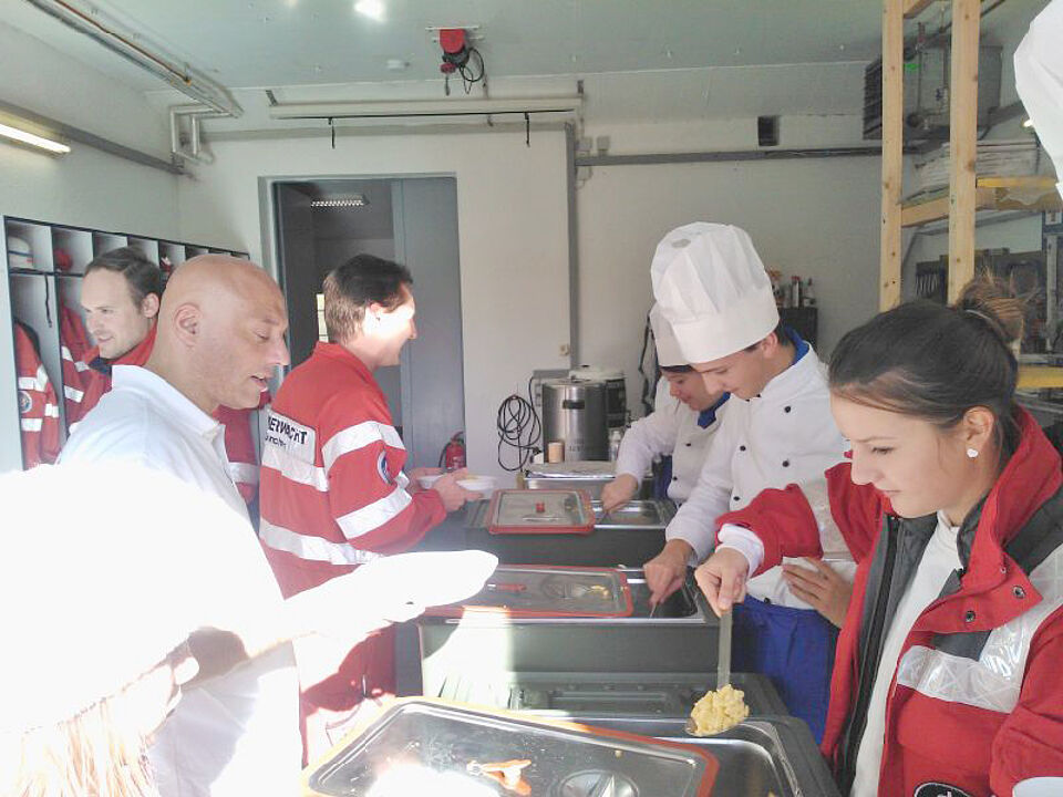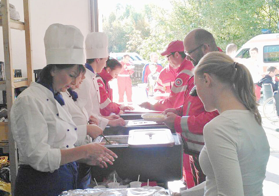 Sechs ehrenamtliche Rotkreuzkollegen der Bereitschaft Deisenhofen sorgten für das leibliche Wohl der rund 100 Übungsteilnehmer. Sie gaben ganztägig warme und kalte Getränke aus und kochten als warmes Mittagessen Geschnetzeltes in Rahmsauce mit Eierspätzle sowie vegetarische Käsespätzle.
