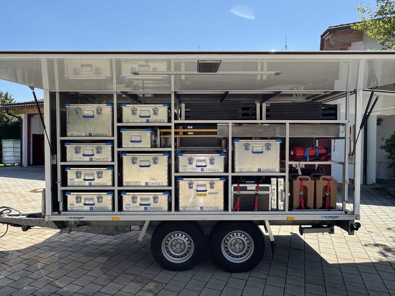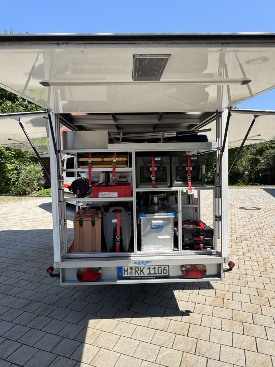 Der zwei Tonnen schwere Anhänger verfügt über eine Doppelachse und führt das Einsatzmaterial in stabilen Aluminiumkisten mit. Vom Kochtopf über Mehrweggeschirr, Hockerkocher, Beleuchtung, Regenschutz und Stromerzeuger ist alles an Bord.